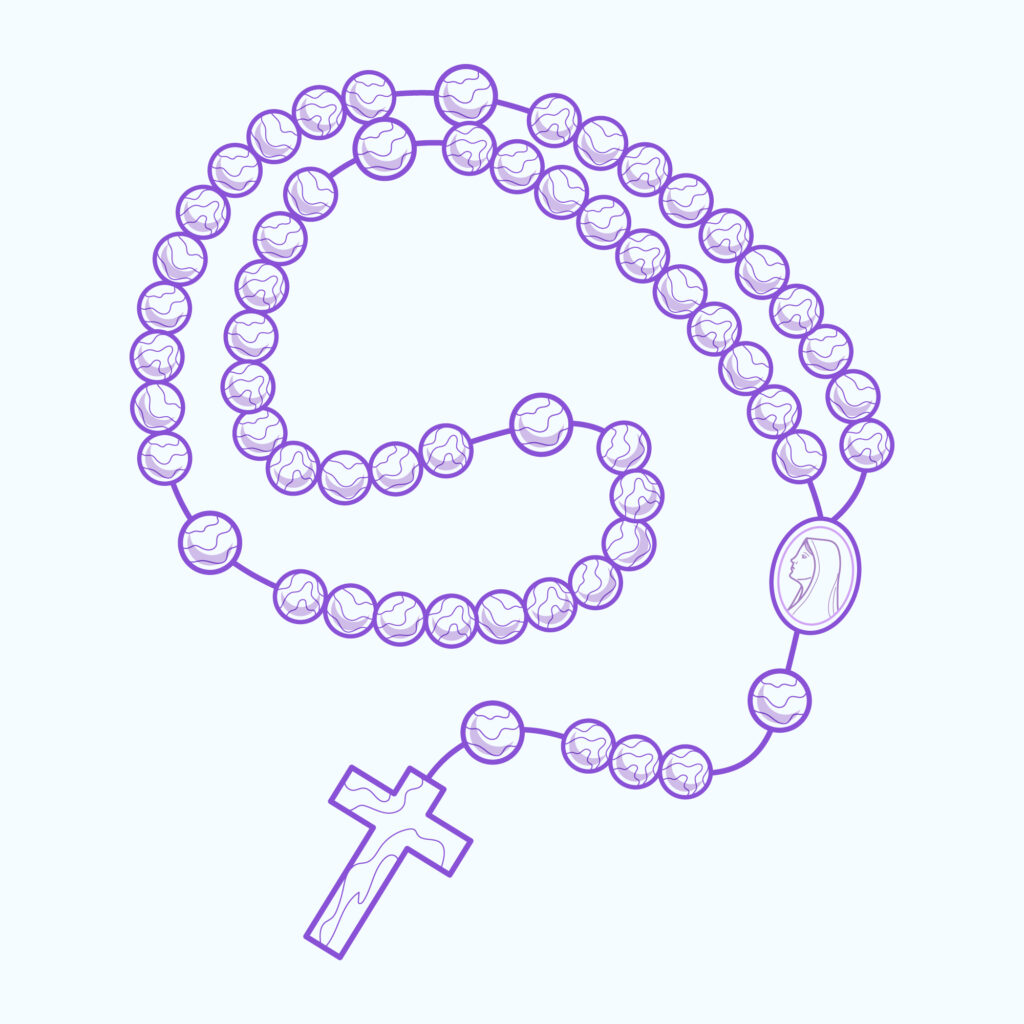 Sur le Premier grain, on dit le Notre Père puis sur les trois grains suivants : trois Je vous salue Marie et le Gloire au Père, hommage d’amour et d’adoration à la Trinité.
